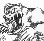 The monster is a remnant of an early attempt at a high school comic strip that I published once or twice before I started the Thing that came to dinner strips. The problem I was having was that it being in a school newspaper, my immediate thought was to parody the school. This if course was not even remotely acceptable in any shape manner or form. So, instead I devised a strip in which you had two kids, one of whom had a dimensional portal in his locker and from this portal a monster would come out every so often. The monsters weren't necessarily bad... just hungry or scary or big. The comic was cute, but it god old after four or so strips and we stopped printing it in favor of the thing that came to dinner strips as they seemed of stronger quality (although less understandable to the general high school public).