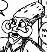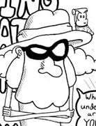 Jake's original design was to make him an old man in a plaid red and white shirt with overalls. He was modeled after two old men I saw in a supermarket in upstate new york. The larger man was dressed as I just mentioned and his friend was bald on top of his head and dressed in a business suit. The two were at such an odd contrast to each other especially to be friends that I had to do a quick sketch of them and create a comic around them. It worked for a little while, Jake worked better than his friend (who I named Jim). Once last year's scribble storyline came along, I had a chance to re-incorporate Jake under different circumstances and this time give him a little less stereotypical a character. I placed him in the roll of a hobo who follows the cast of the story along. He represents a compassion and respect I feel toward the elderly, despite how goofy he may act. The reasons for doing what he does shows that despite his age, he can still dream (the pilot hat) and he can still go on adventures and have fun.